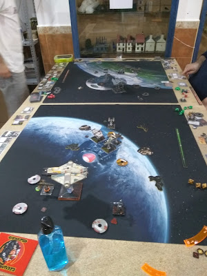 Turno a turno, nos vamos atacando, yo logro derribar a Zuckuss y al Scurrg H-6, mientras que Fran me quita media vida de cada nave, pero en el ultimo turno, Norra suelta su segunda y ultima bomba, alcanzando al M3A que pierde su ultima vida y gracias a ello gano la partida.